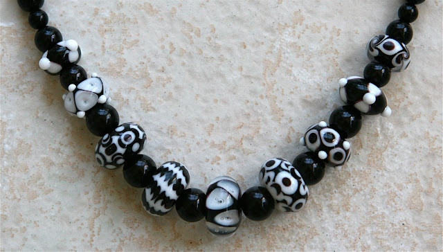 I actually made these black and white beads a long time ago at various times. I've been getting ready to make this necklace for a friend of mine whose birthday is coming up. She had asked about a simple black and white necklace so I hope this is what she had in mind. Guess I'll find out soon!